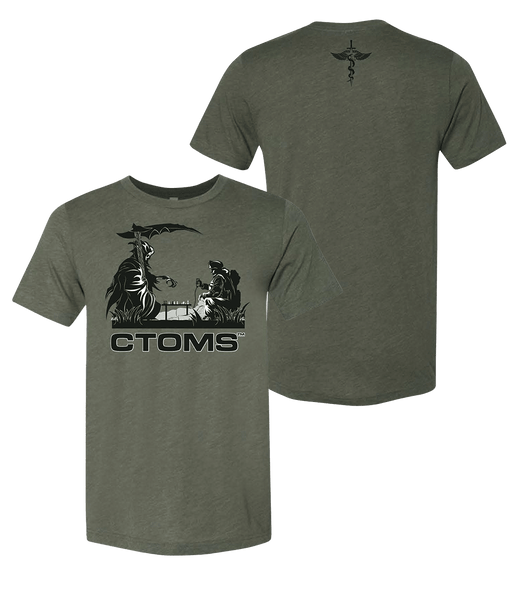 Description This triblend military green t-shirt features our iconic depiction of a medic thinking ahead of his adversary on the front and a classi...
