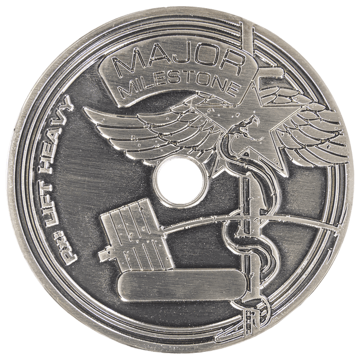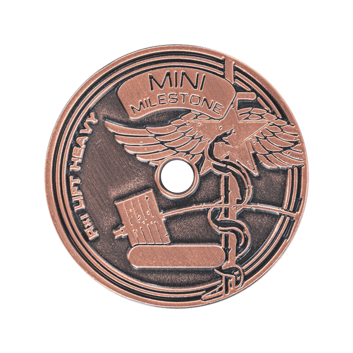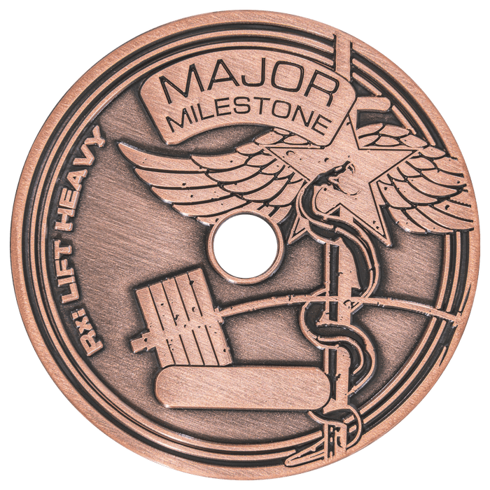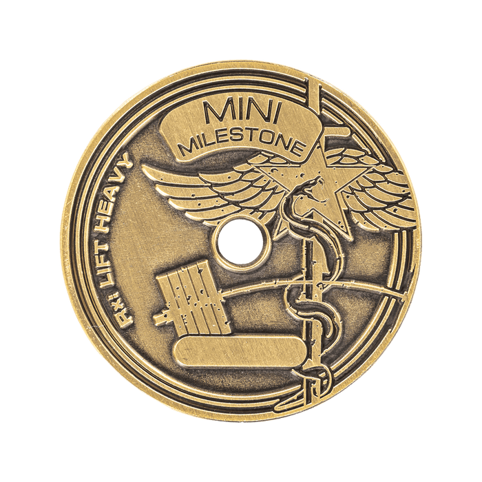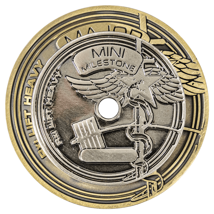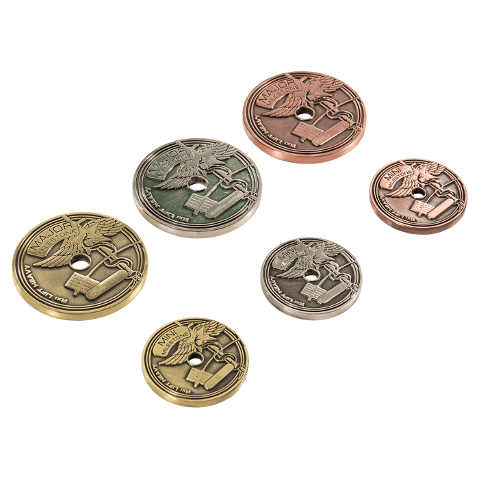 Combine your own set of our Gold (Squat), Silver (Deadlift), and Bronze (Bench Press) challenge coins: Major Milestones for the big wins, Mini Milestones for the crucial steps in between.