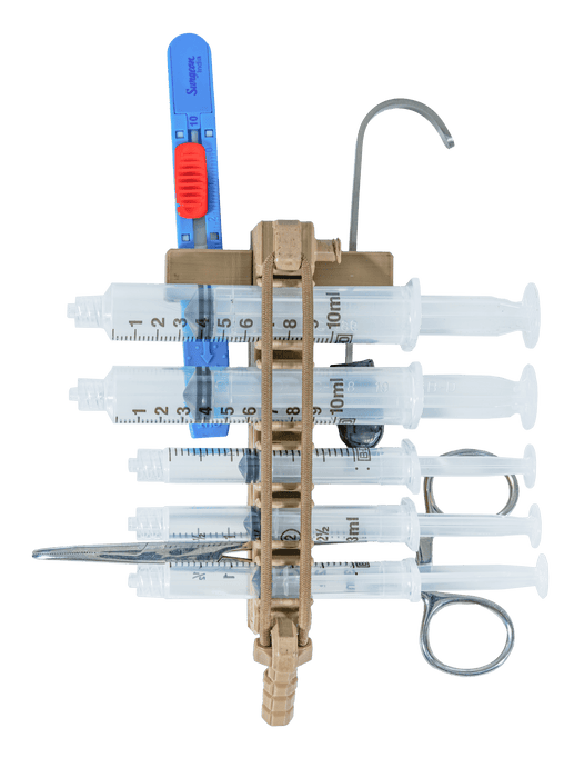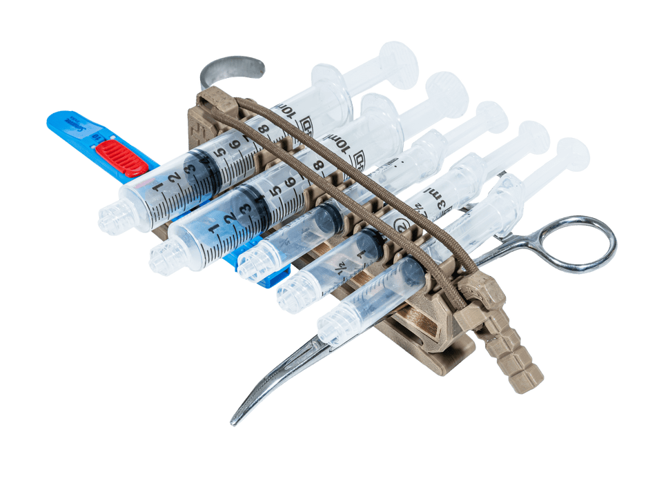 The FieldMate™ V1 is a rugged, compact syringe organizer engineered for rapid deployment in high-stakes environments. Designed to streamline injectable medication access and delivery, it provides fast, secure retention for multiple syringe sizes, keeping your dosing kit ready when seconds matter.