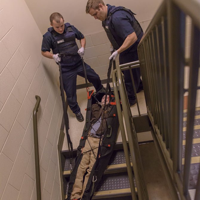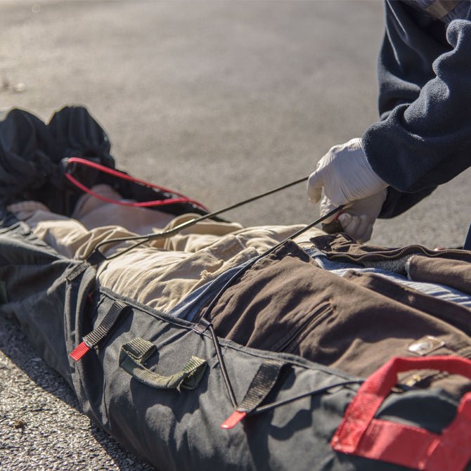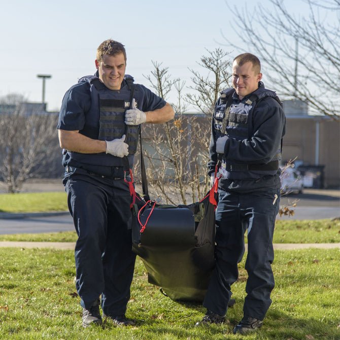 For the first responder, the patient cocooned in the Xtract®SR can be pulled, or lifted, with minimal fatigue and a reduced risk of injury. With the straps engaged in the pulling position, providers utilize the large muscle groups in their legs and shoulders to efficiently move the patient across undefined terrain. In addition to needing fewer responders and freeing up the arms and hands of the provider for stability and secondary functions, the engineered design position of the pull straps promotes a more neutral head position for the patient.